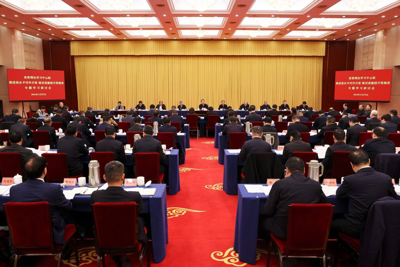 11月29日,省委理論學(xué)習(xí)中心組圍繞“推進(jìn)高水平對外開放、建設(shè)高能級開放強(qiáng)省”主題舉行專題學(xué)習(xí)研討會,省委書記、省長王浩主持會議并講話。
